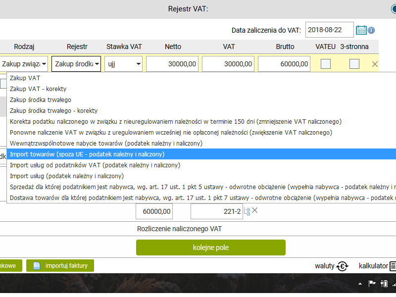 Najpierw wprowadzimy przykładowe księgowanie, aby następnie wygenerować automatycznie gotową do wysłania deklarację VAT-7.